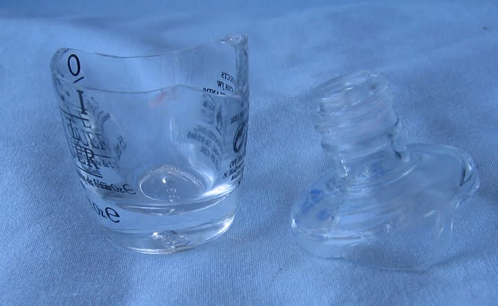 Glass failure analysis expert witness performs failure analysis on a broken small cosmetic bottle. This bottle failure occured when it was being capped on the line. The objective of the analysis was to determine the cause of the failure and to advise the bottle manufacturer. The bottle broke into two pieces, and these are shown in the upper left photograph. Upper right is a 20X photomicrograph of the failure origin. This failure originated as a result of a “chill crack” which is a manufacturing defect formed when, exiting the clam shell tool, the hot bottle touched an unprotected metal tool. The cold spot created a chill crack that eventually caused the bottle failure. The manufacturer is presently correcting the manufacturing problem. In the meantime, only bottles from another supplier are being used.