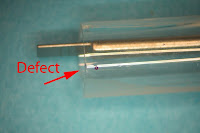 Glass expert performed a root cause failure analysis on failed reed switches. The upper left photograph shows the type of reed switch that was failing. This switch consists of two ferromagnetic “blades” that are enclosed in glass. At either end are leads that pass through glass-to-metal seals. The sealed tube is filled with inert gas which is introduced through a side tube that is heat sealed after the gas has been introduced. The switch is activated magnetically. The glass expert performed a glass failure analysis and determined that the glass envelopes were cracking due to the presence of mechanical damage (i.e. scratches) on the outer surface of the glass. All the cracks initiated at a flaw and then proceeded circumferentially till the two halves of the crack met on the opposite side from the origin. It is believed that the source of the failure stress was thermal stress generated by heating during potting and assembly. Without the pre-existing flaw on the outer glass surface, the switch would not have failed. The center photograph shows the initial crack leaving the origin in two directions. These two halves of the crack eventually meet on the side opposite the origin. The upper right photograph shows the surface flaw where the crack originated. These switches failed as a result of a manufacturing defect.