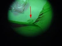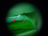 Glass failure analysis expert performed a root cause failure analysis on a bottle failure. The cap on this bottle had not been removed. The failure analysis revealed a manufacturing defect on the bottle interior. On the upper left photo is a 30X photomicrograph of a portion of the origin on the fracture surface. The arrows show the travel direction of the crack exiting the origin. On the upper right is a 30X photonicrograph of the origin as it appears on the interior surface of the bottle. There is a “chip” associated with the origin; therefore, this is a product defect on the bottle interior.