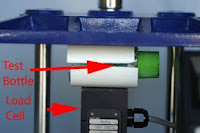 Glass failure analysis expert performed bottle strength tests to determine the strength of a cylindrical glass bottle. The bottle is approximately 0.85″ in diameter and 2.35″ tall. The glass thickness is approximately 0.040″ thick. It was hypothesized that a female could squeeze the bottle hard enough to crush it. Glass strength was measured by compressing the bottle both radially and axially. Upper left photograph shows the radial “squeeze test. The human hand is soft; therefore the test bottle was compressed between soft vinyl plastic tubing. In this orientation the bottle could withstand a minimum og 240 pounds force. The upper right photograph shows the “axial” strength test. Again, no hard surface touches the vial. Axially the bottle can withstand a minimum of 130 pounds. Even though the bottle may have many surface defects, it is strong because it is under compressive stresses. Because glass fails in tension, the cylindrical shape insures the highest strength. Because the bottle has no flat surfaces, it can withstand very high forces. No average female could generate sufficent forces with their hand to crush this bottle.