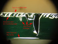 Glass expert describes the condition of the edges of windows, mirrors and other flat glass pieces. Almost all flat glass pieces are shaped from larger pieces using glass scribe and break techniques. Thus the edge of the part has two distinct sides. The photograph above is a microscopic picture of a the edge of an automobile mirror that was shaped in automatic scribing machinery. The top of the photomicrograph is the surface where the scribing tool has created controlled glass damage (i.e. crush). In general the damage is uniform. This photo incorporates start of the glass scribing, and this point always has more significant damage. Glass failure analysis determined that glass cracking due to thermal stresses initiated at the start point. Glass fracture analysis indicates that glass cracking always starts at the weakest point under tensile stresses.