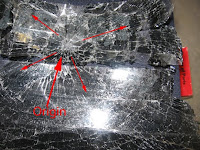 Glass failure analysis expert demonstrates how to locate the origin of a tempered glass failure. Glass failure analysis of a tempered glass piece is difficult (if not impossible) because tempered glass fracture results in many small pieces. In many cases the glass failure falls apart and there is no pattern left to trace to the origin. The photograph above provides a pattern that can be a useful tool for locating the general location of the failure origion of a partial crack pattern. In the above example a glass expert taped a tempered glass pickup truck rear window with transparent tape and impacted it with a simulated human head. The resulting crack pattern is preserved. The impact point is the center of a “web” of cracks. The predominant pattern is a series of “spokes” eminating from the impact point which is also the failure origin.