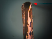 Glass failure expert witness performs a root cause failure analysis on a failed wine glass. Failure analysis revealed that the failure initiated on the inside edge at the bead on the top. The top left photograph shows the re-assembled glass; the arrow indicates the crack starting point. The upper right photograph is a 40X photomicrograph of the fracture surface; the fracture initiation point is indicated by the arrow. The crack formed at the top bead on the interior of the glass. The asymetry of the Wallner lines demonstrates that the crack progressed under bending stresses. Since there are no signs of impact, squeezing the glass ss must have been the cause of failure.